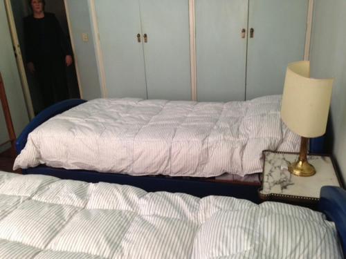 1 dormitorio con 2 camas y mesa con lámpara en Casa de Familia - Solo Para Mujeres *Woman ONLY* en Buenos Aires